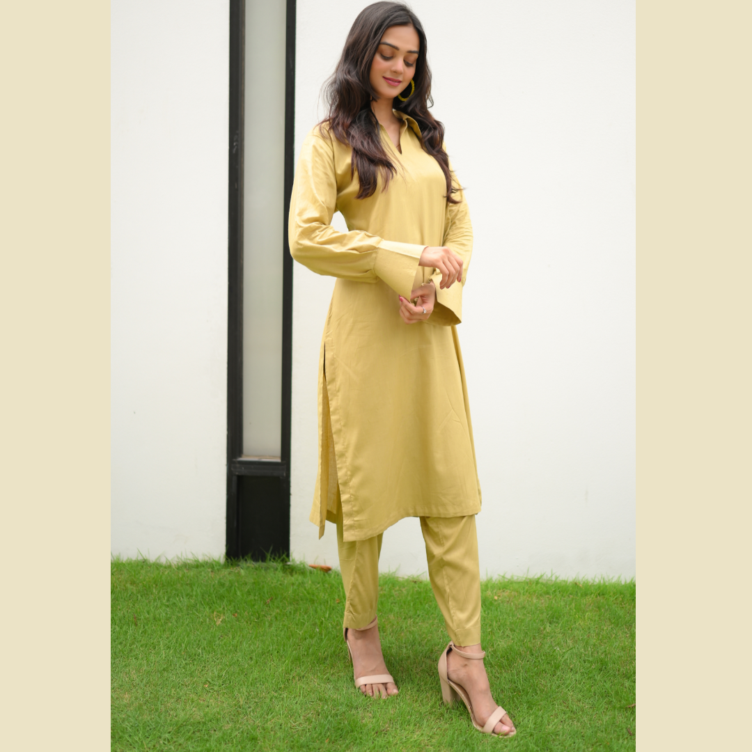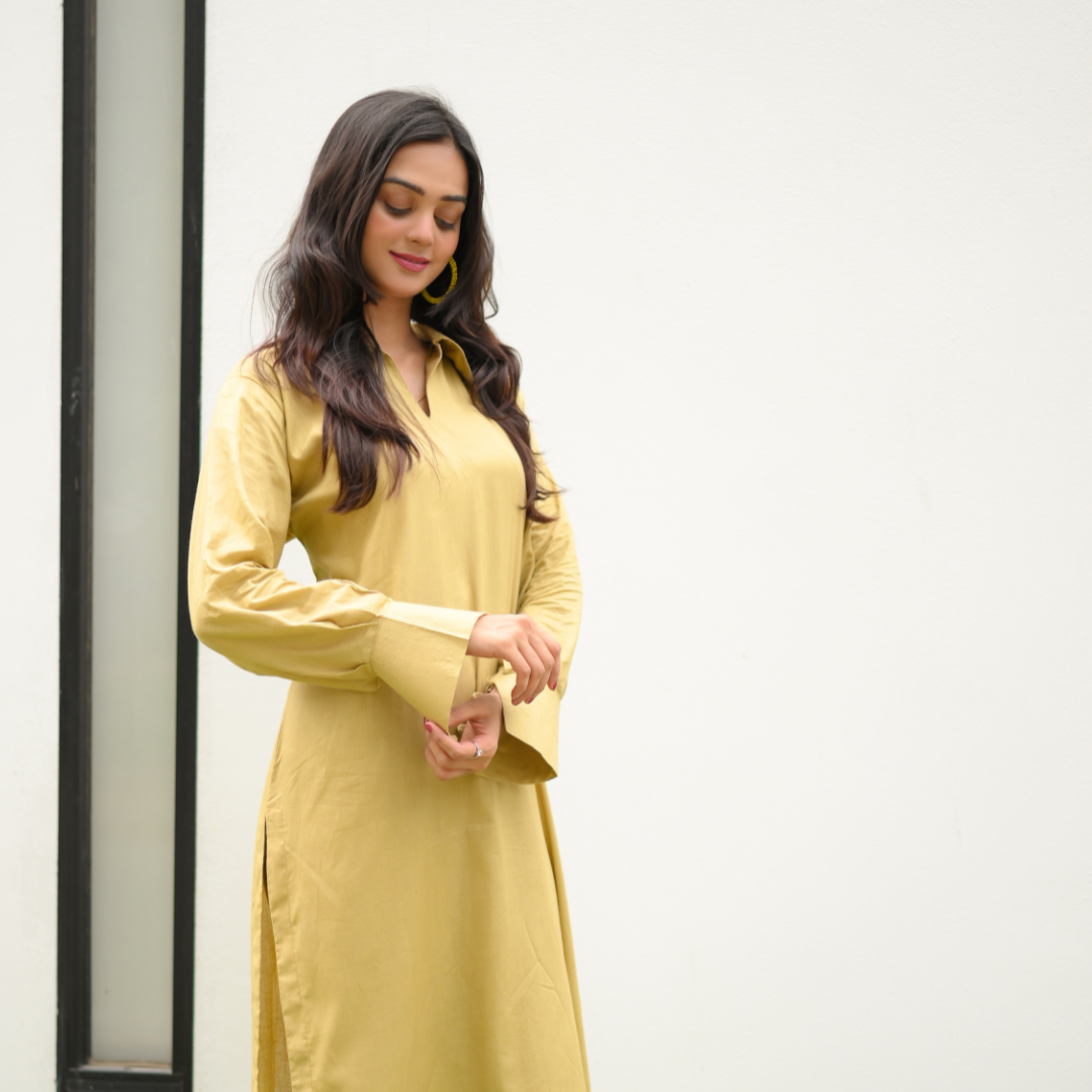 This ready-to-wear dress features a classic collar and full sleeves with open cuffs, offering a timeless and polished look. Perfect for any occasion, the Golden Glow dress combines style and comfort seamlessly.
