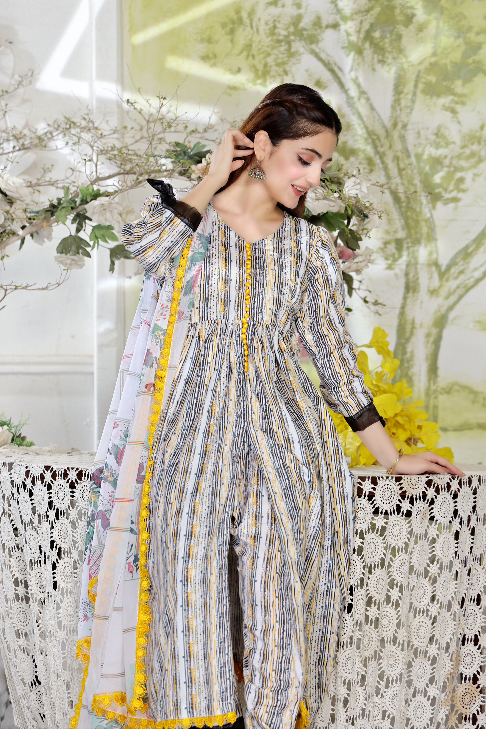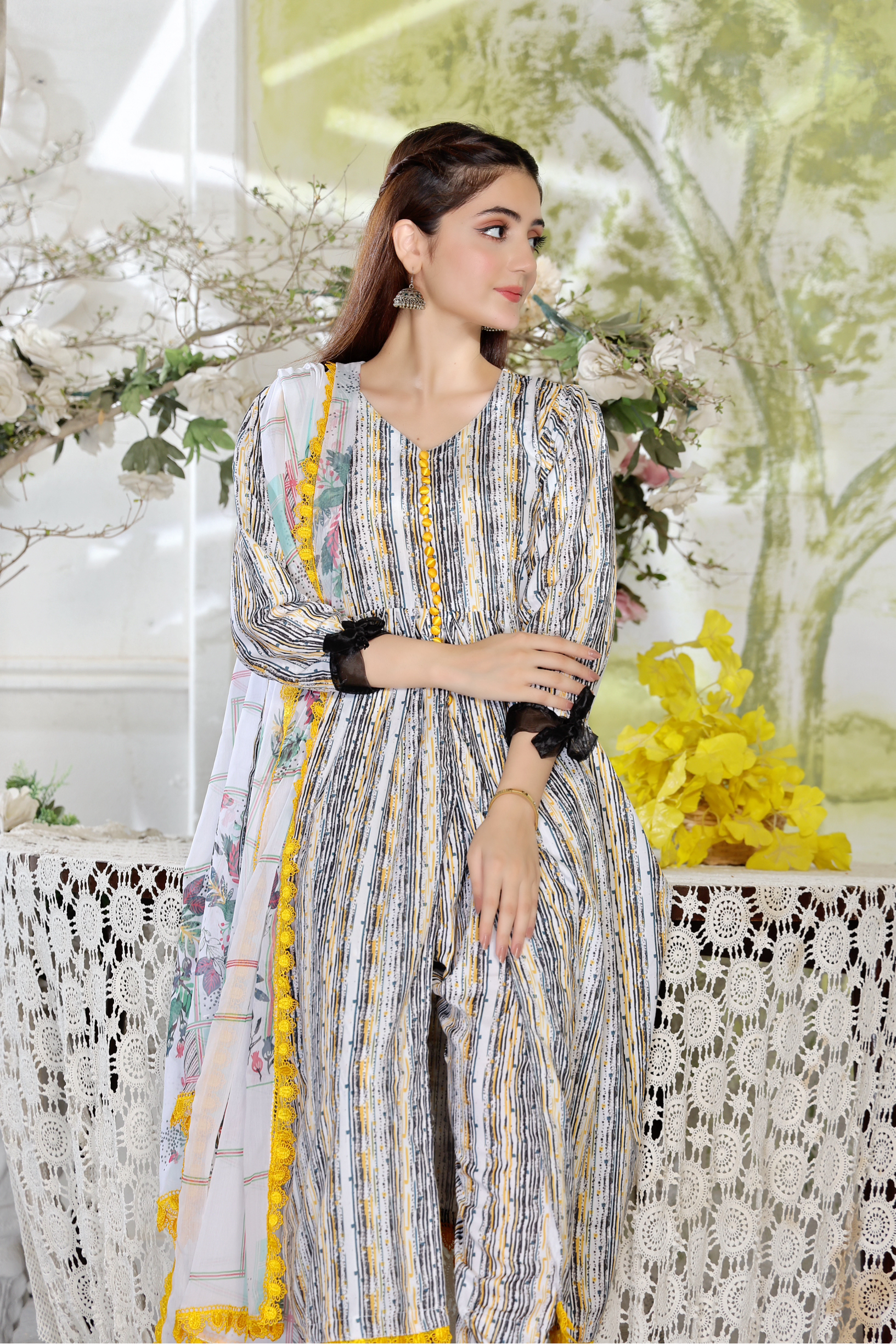 Elevate your wardrobe with this exquisite unstitched Swiss lawn dress set, crafted from premium quality fabric. Each set includes three pieces: a beautifully printed Swiss lawn shirt and trouser fabric, and a soft chiffon dupatta adorned with delicate prints.